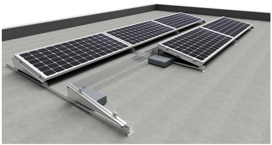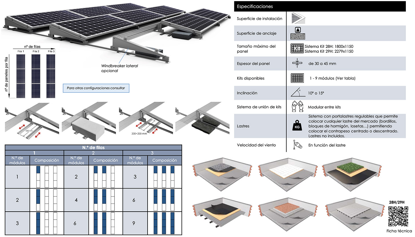Soporte inclinado lastrado para cubierta plana 28H-29H. Sistema autoportante para cubiertas planas ≤5o tipo tela asfáltica, grava, ajardinada, tipo Deck, etc… donde no se puede taladrar. El sistema modular premontado y su liviano peso hacen de este sistema un montaje e instalación rápido y sencillo sin necesidad de realizar ningún tipo de obra, ahorrando así en tiempo.