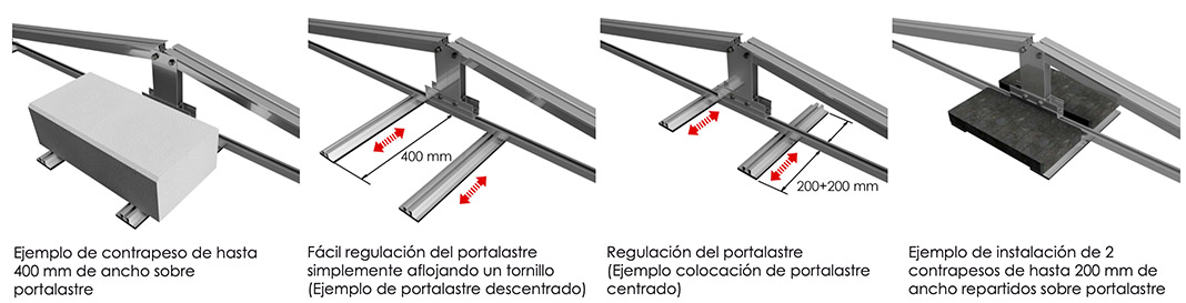 Este soporte incorpora un sistema único en el sector de portalastres regulables que permite colocar cualquier tipo de lastre del mercado, incluso descatalogados, se adapta a cualquier tamaño y tipo de contrapeso (bordillos, bloques de hormigón…) pudiendo colocar el contrapeso descentrado o centrado repartiendo así el peso.